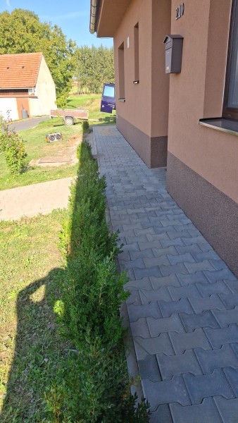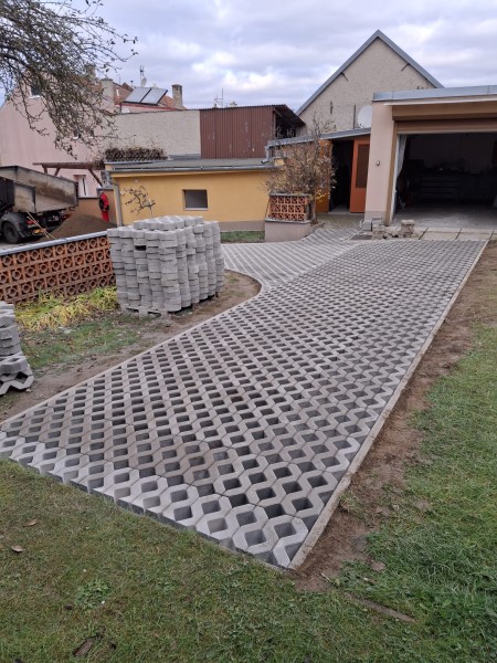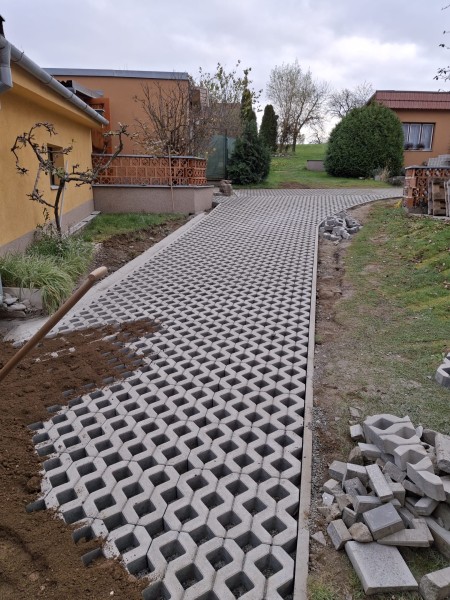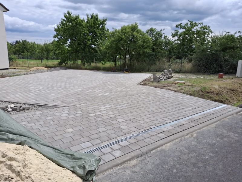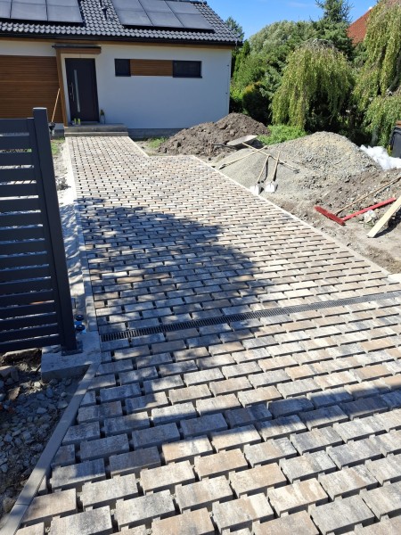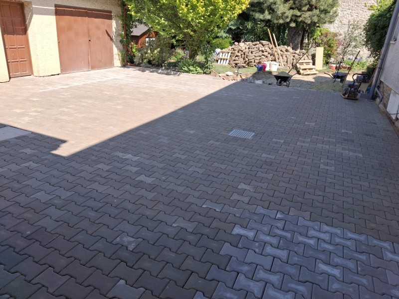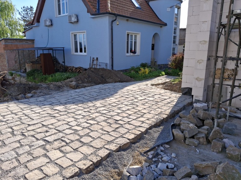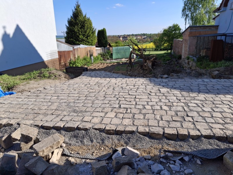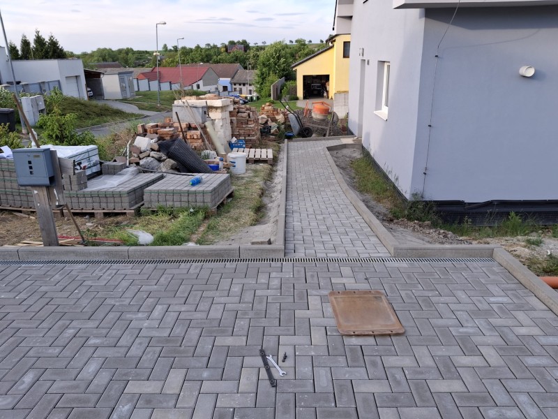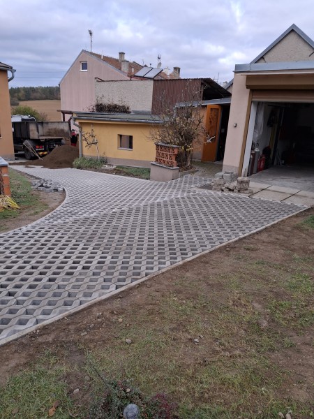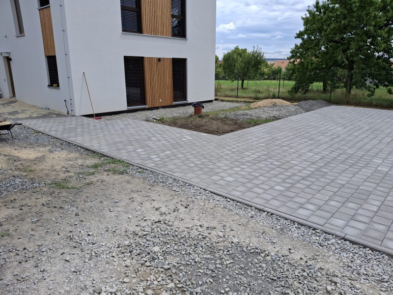 Příjezd ke garáži, dvorek a chodníky kolem domu - RD Račice