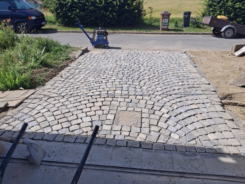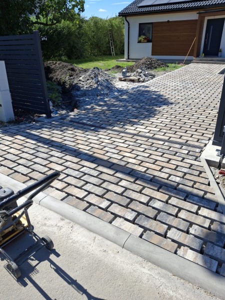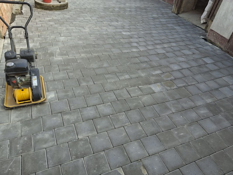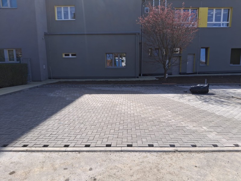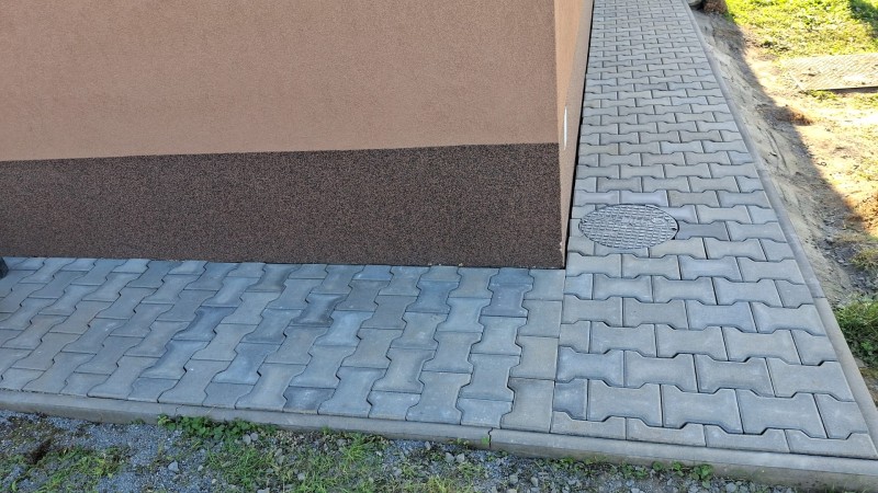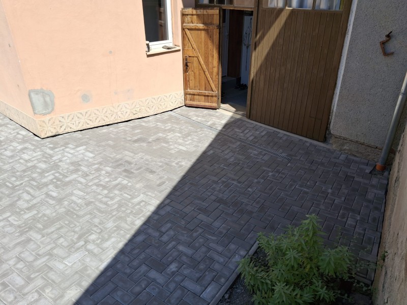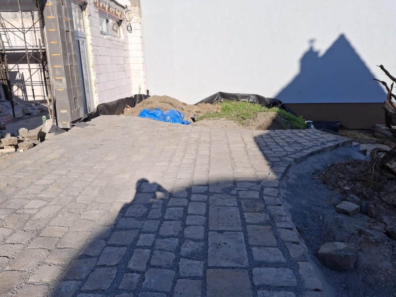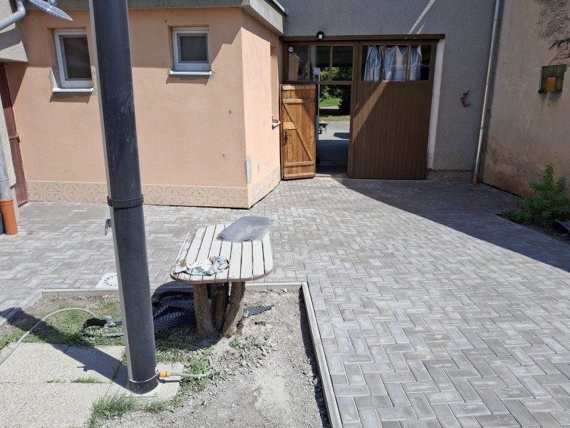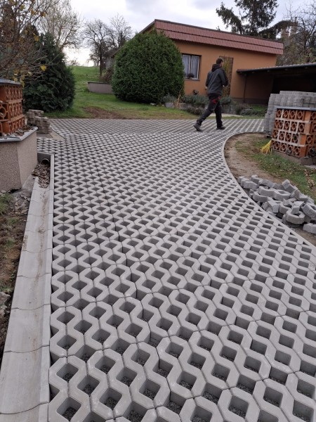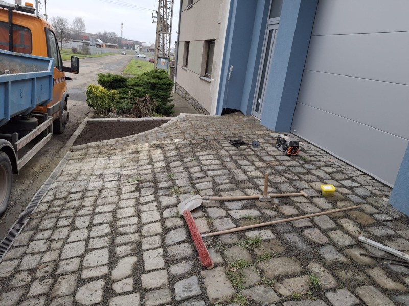 Příjezd ke garáži, dvorek a chodníky kolem domu - RD Račice