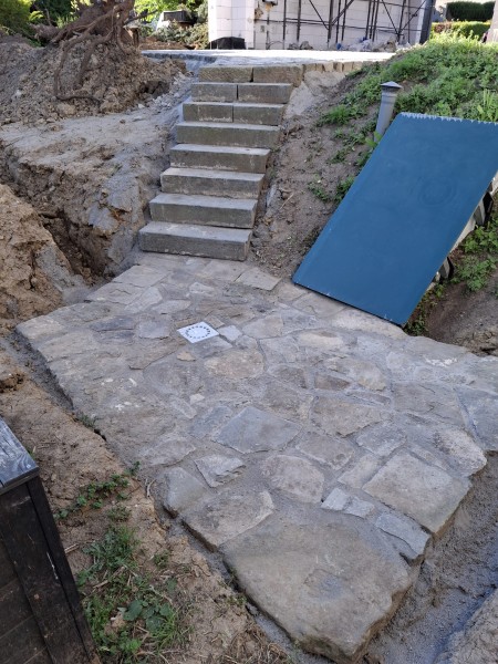 Dláždění dvorku, opěrná zeď a kamenné schodiště - RD Studnice